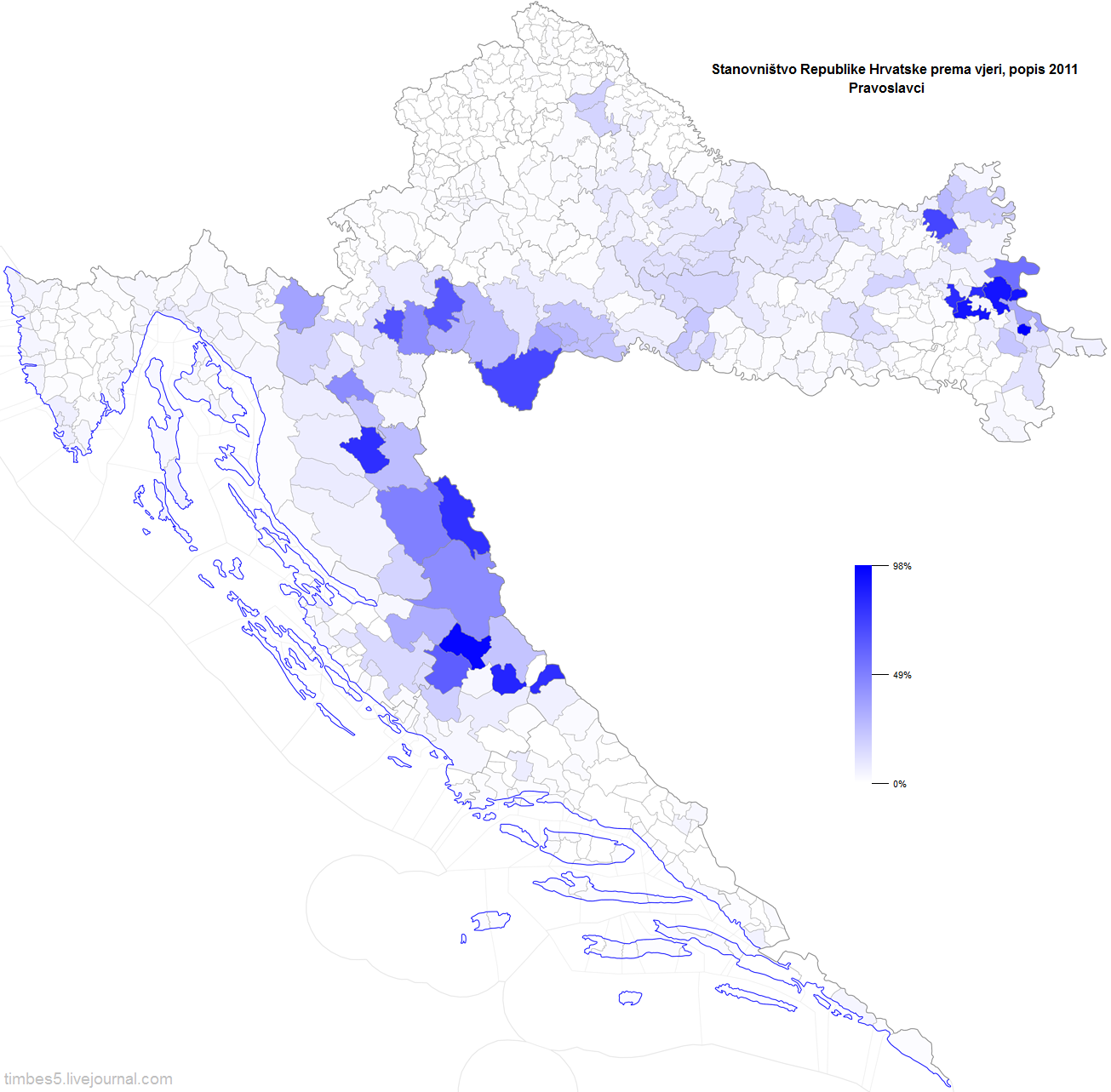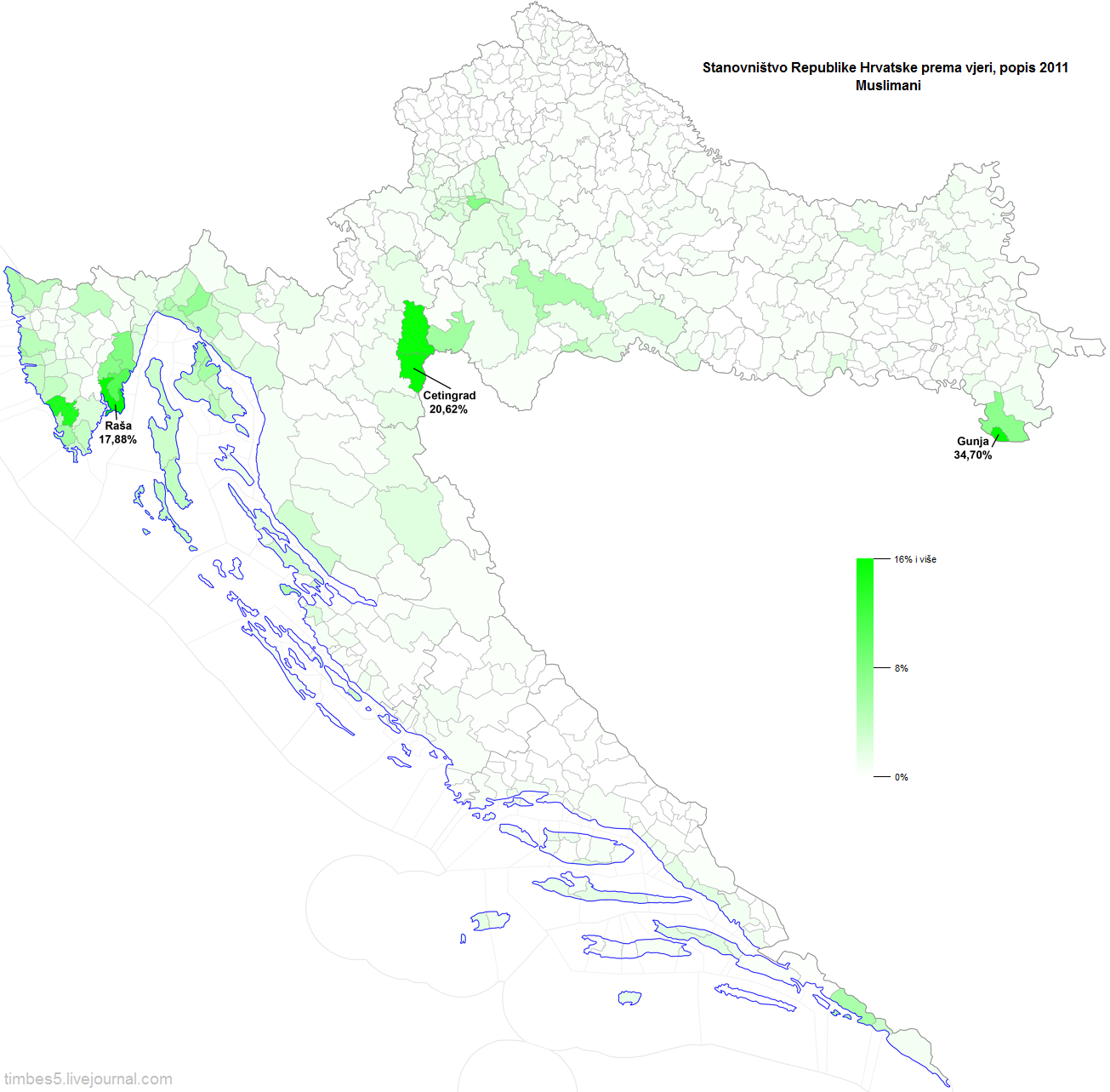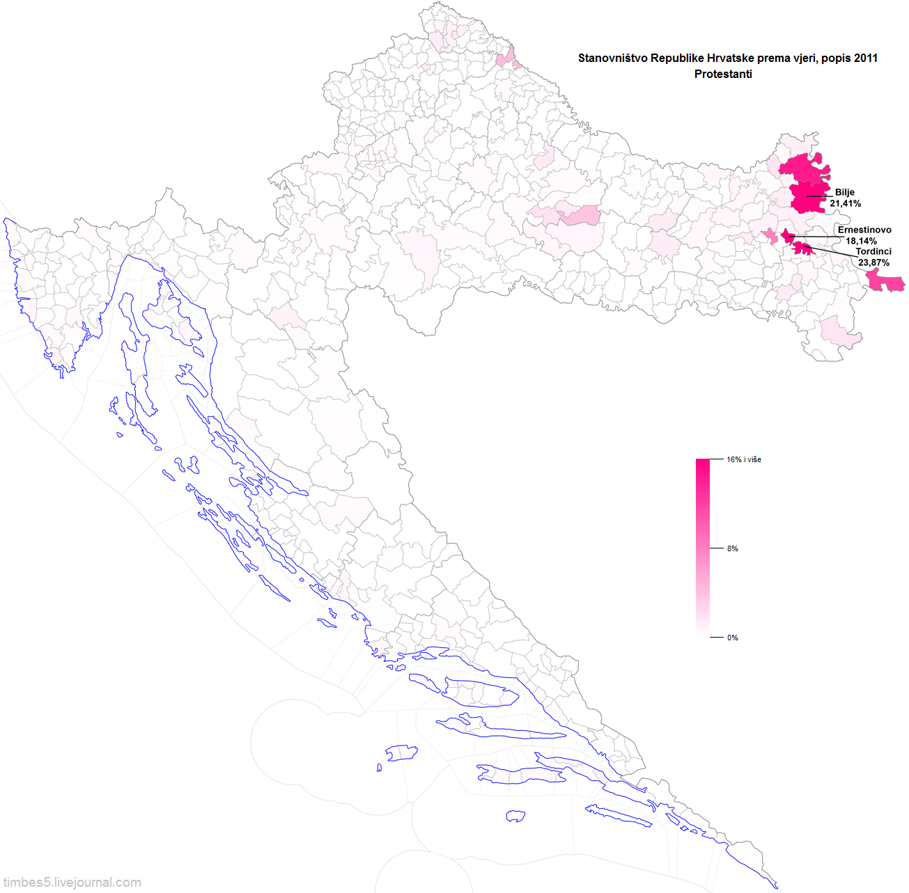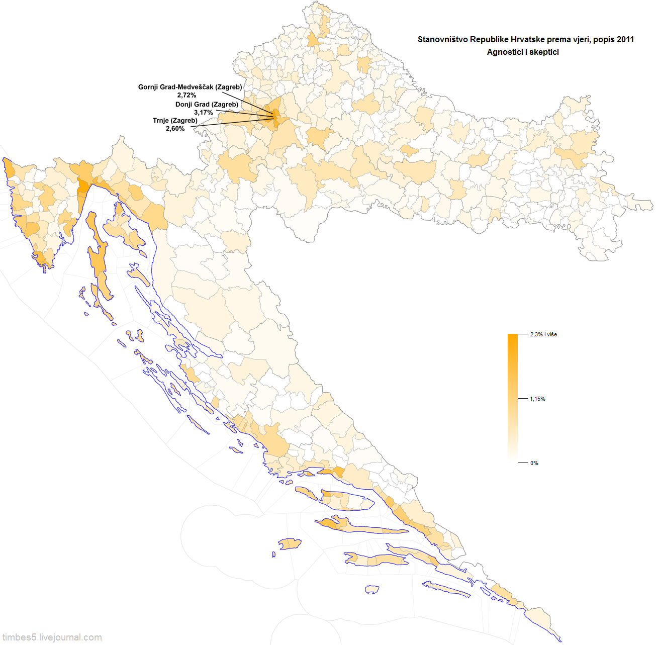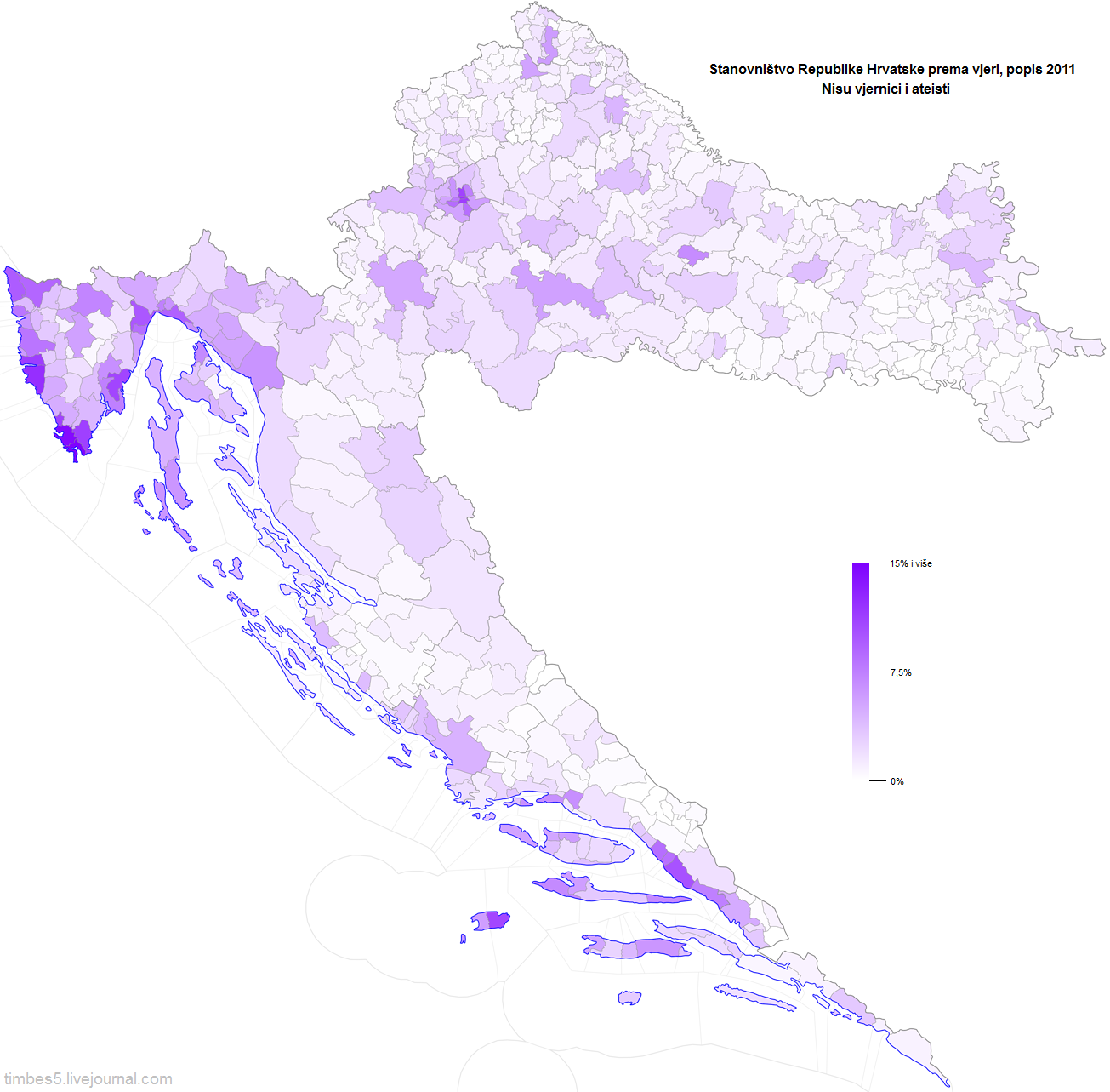 Две последних похожих друг на друга карты наверно самые любопытные. Прекрасно видна нерелигиозность Загреба, побережья Истрии и Кварнерского залива, полоски побережья между Сплитом и Дубровником и вообще повышенная нерелигиозность в городах.