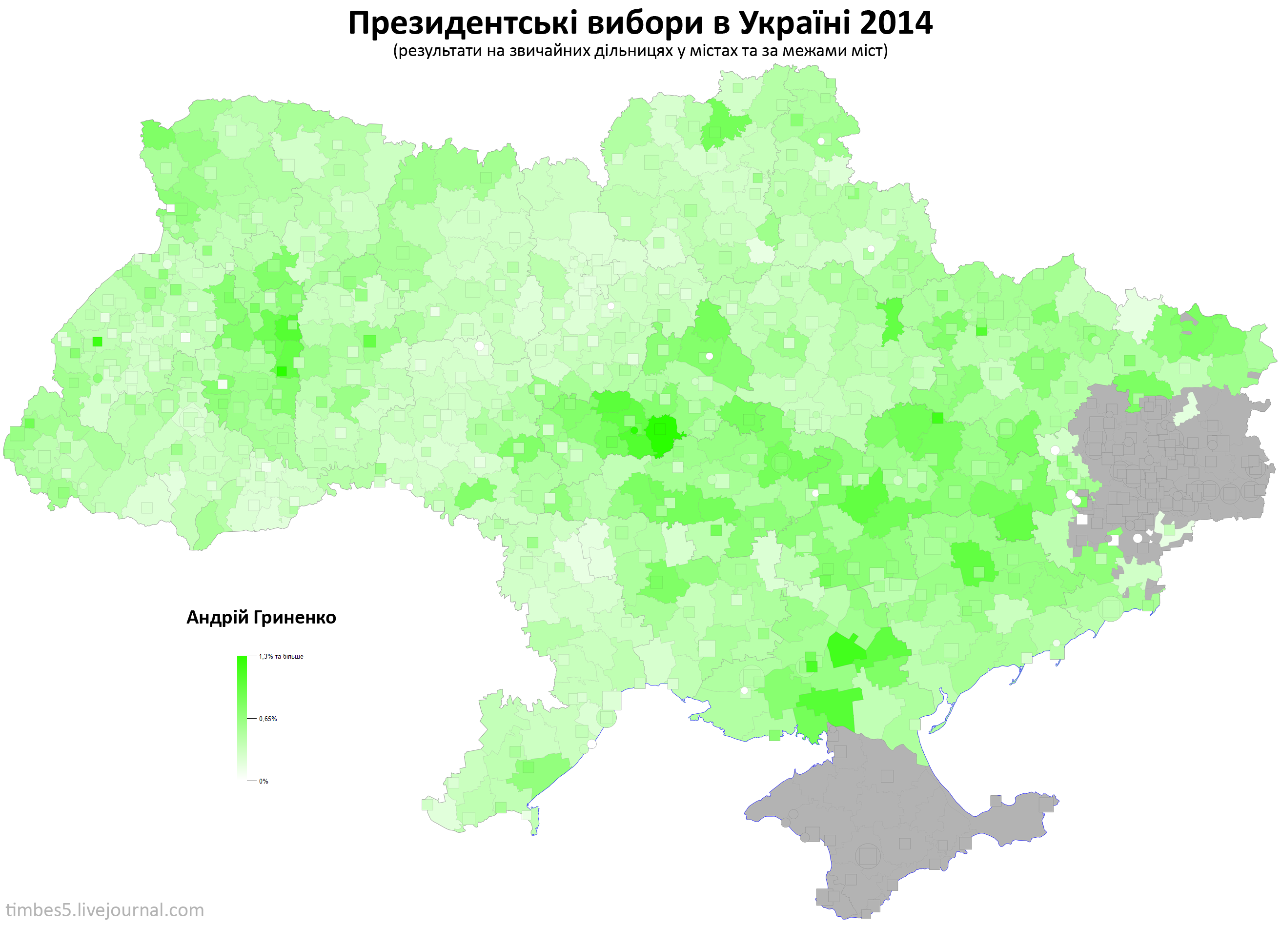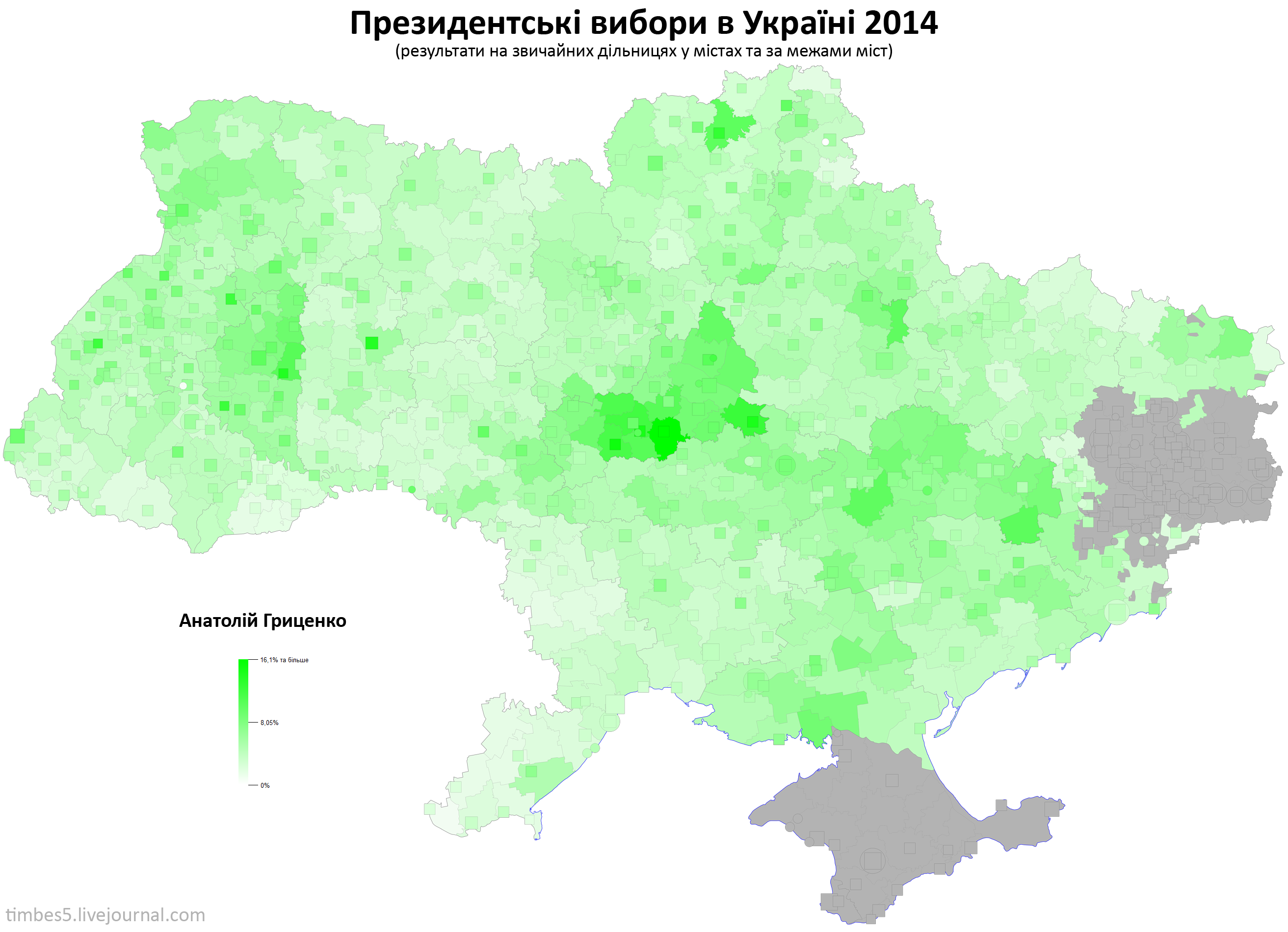 Понятно, что Гриненко - это псевдоклон Гриценко, и очень сильная корреляция с результатами последнего это подтверждает, но только вне городов. Ибо Гриненко "оказался" очень сельским кандидатом (очевидно, просто потому что в сёлах люди, дипломатически говоря, неразборчивее), а Гриценко за счёт этого наоборот стал ещё более городским, чем мог бы быть без кандидата-клона.