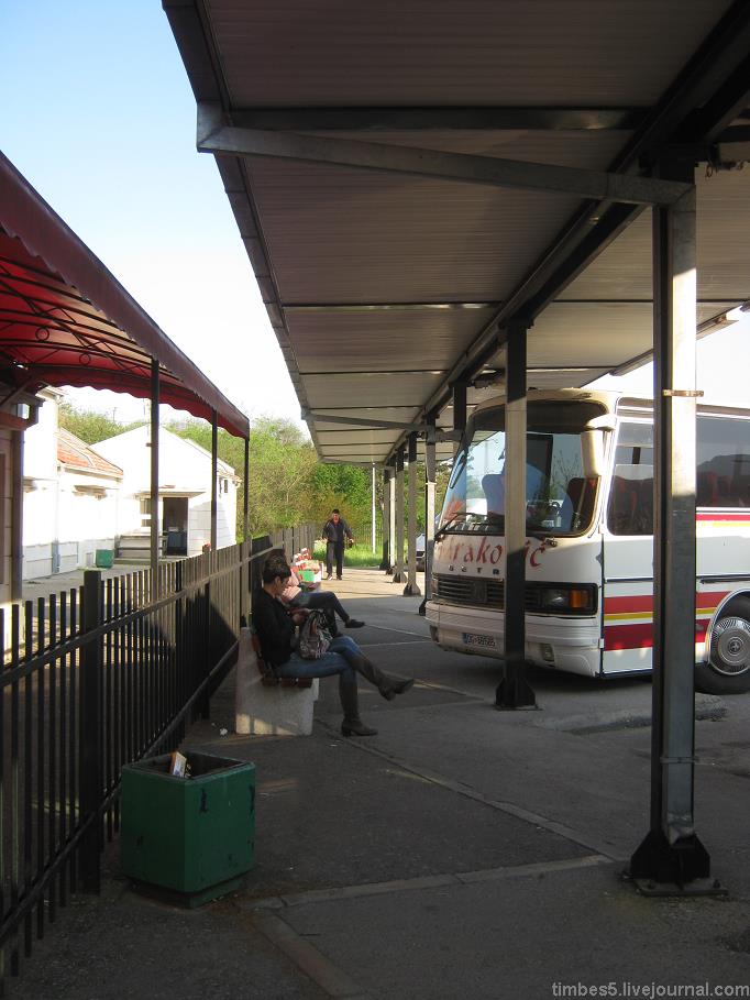 Автовокзал, отделённый от платформы забором, вход на которую - только для пассажиров. Весь маразм ситуации в том, что после установки забора платформа оказалась исчезающе малой и пришлось дополнительно залить ещё метр бетона за изначальным бордюром.
